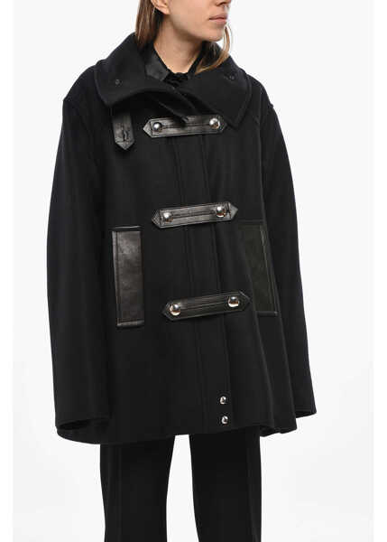 Double-Breasted Wool Blend Coat With Leather Details - Descriere