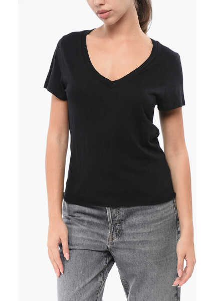 Solid Color Cotton Blend V-Neck T-Shirt - Descriere